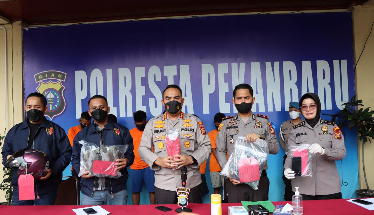 Didampingi Kasat Reskrim Kompol Andrie Setiawan dan Kapolsek Tampan, Kompol I Komang Aswatama, Kapolresta Pekanbaru, Kombes Pol Pria Budi mengatakan, ketujuh orang pelaku yang merupakan kelompok geng motor tersebut adalah PR (18) seorang karyawan swasta yang tinggal di daerah Kecamatan Payung Sekaki, Pekanbaru. Selanjutnya RMS (19), yang juga merupakan warga Payung Sekaki.
