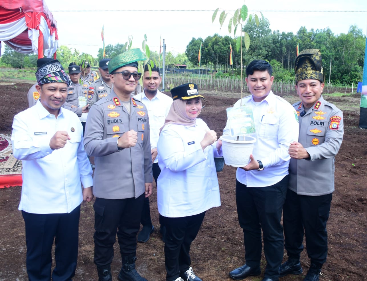 BENGKALIS|Lintaspena.com– Bupati Bengkalis Kasmarni dan Kapolda Riau Irjen Pol Herry Heryawan menanam pohon Geronggang di Kampung Tangguh Polres Bengkalis, di Jalan Poros Sungai Alam, Rabu, 16 April 2025.