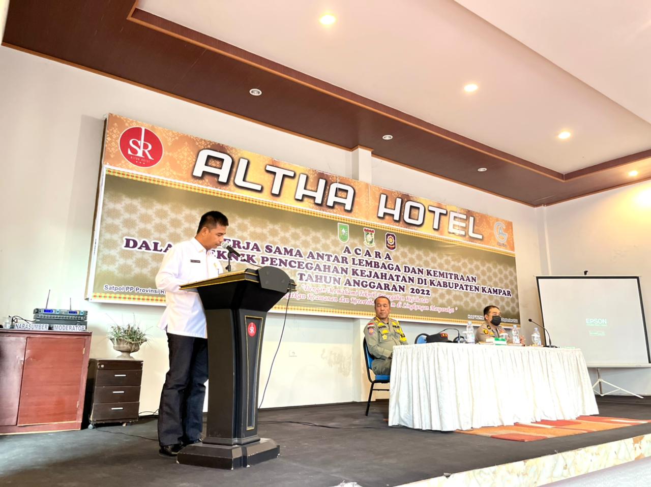 Bangkinang, Lintaspena.com – Pj. Bupati Kampar Dr. H. Kamsol, MM yang diwakili oleh Asisten Pemerintahan Setda Kampar, Ahmad Yuzar, membuka Kegiatan Kerja Sama antar Lembaga dan Kemitraan dalam teknik pencegahan kejahatan di Kabupaten Kampar, yang dilaksanakan di Altha Hotel, Bangkinang Kota, Rabu (14/9/2022). Oleh sebab itu di tuntut kepada Seluruh Anggota Satpol PP dan Instansi terkait untuk selalu meingkatkan Kemampuan dan Profesionalisme Pemahaman Terkait Peraturan Perundang-undangan.
