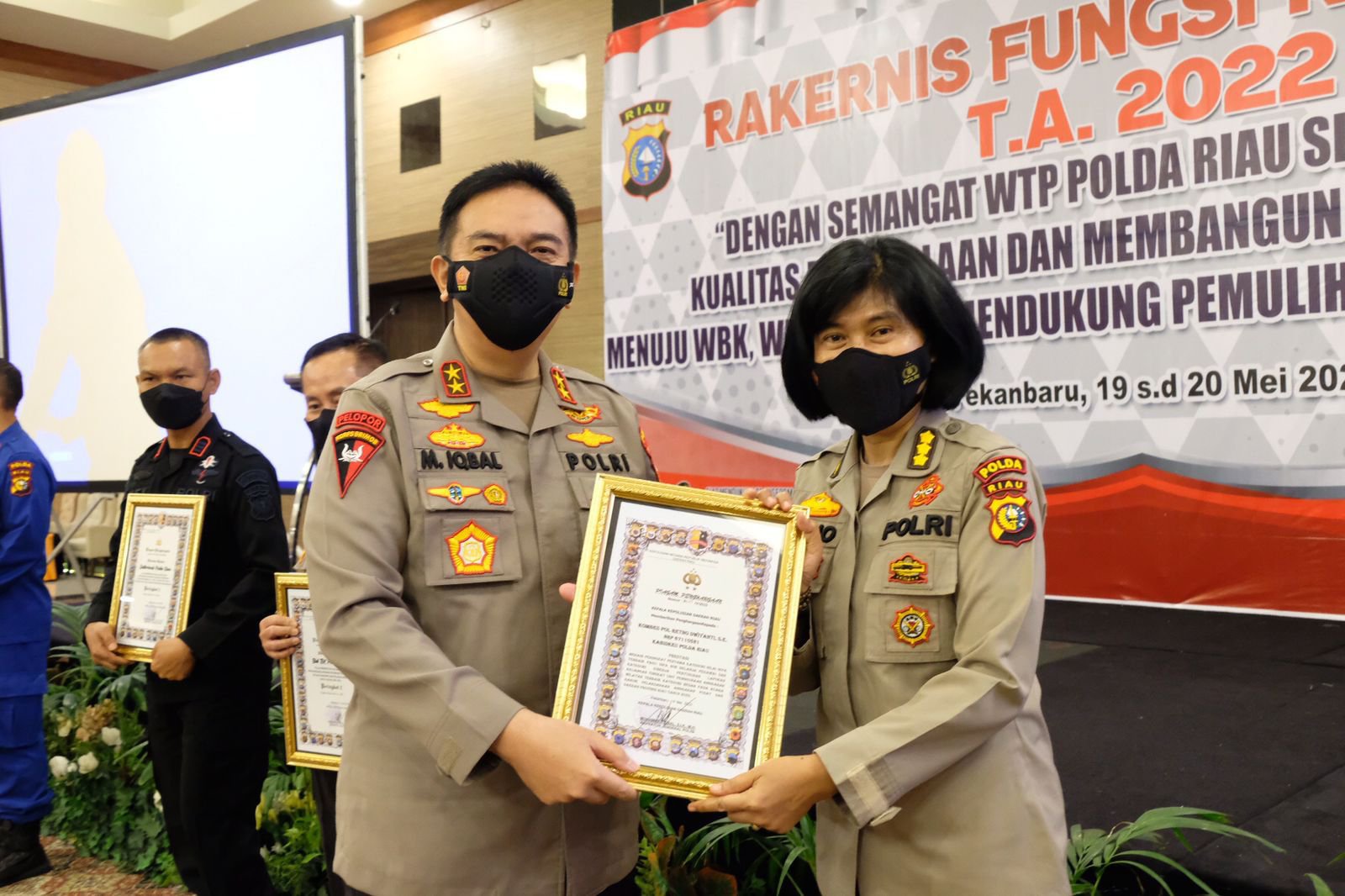 Diawal Rakernis, Kapolda memberikan penghargaan kepada Datker berprestasi dalam penyelenggaraan keuangan. Dua kategori penerima penghargaan yakni Satker yang berprestasi dalam menyusun Pertanggungjawaban keuangan Tunjangan kinerja TA. 2021, sebagai peringkat I adalah Satker Direktorat Lalulintas, kedua Direktorat Polairud dan ketiga Sat Brimob Polda Riau.