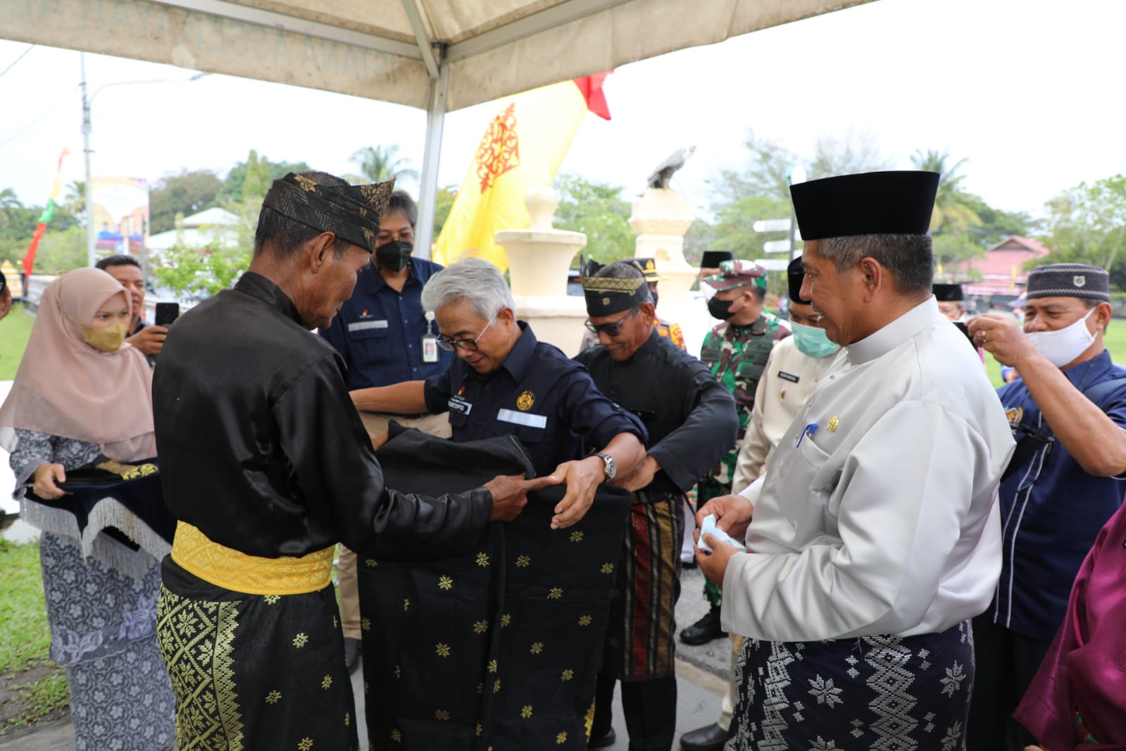 Sebelum memasuki Istana, Kepala SKK Migas Dwi Soejipto dan Kepala Perwakilan SKK Migas Sumbagut Rikky Rahmat Firdaus terlebih dahulu dipakaikan Kain Samping atau Kain Tenun Khas Melayu oleh Ketua Lembaga Adat Melayu Riau Kabupaten Siak Datuk Wan Said.