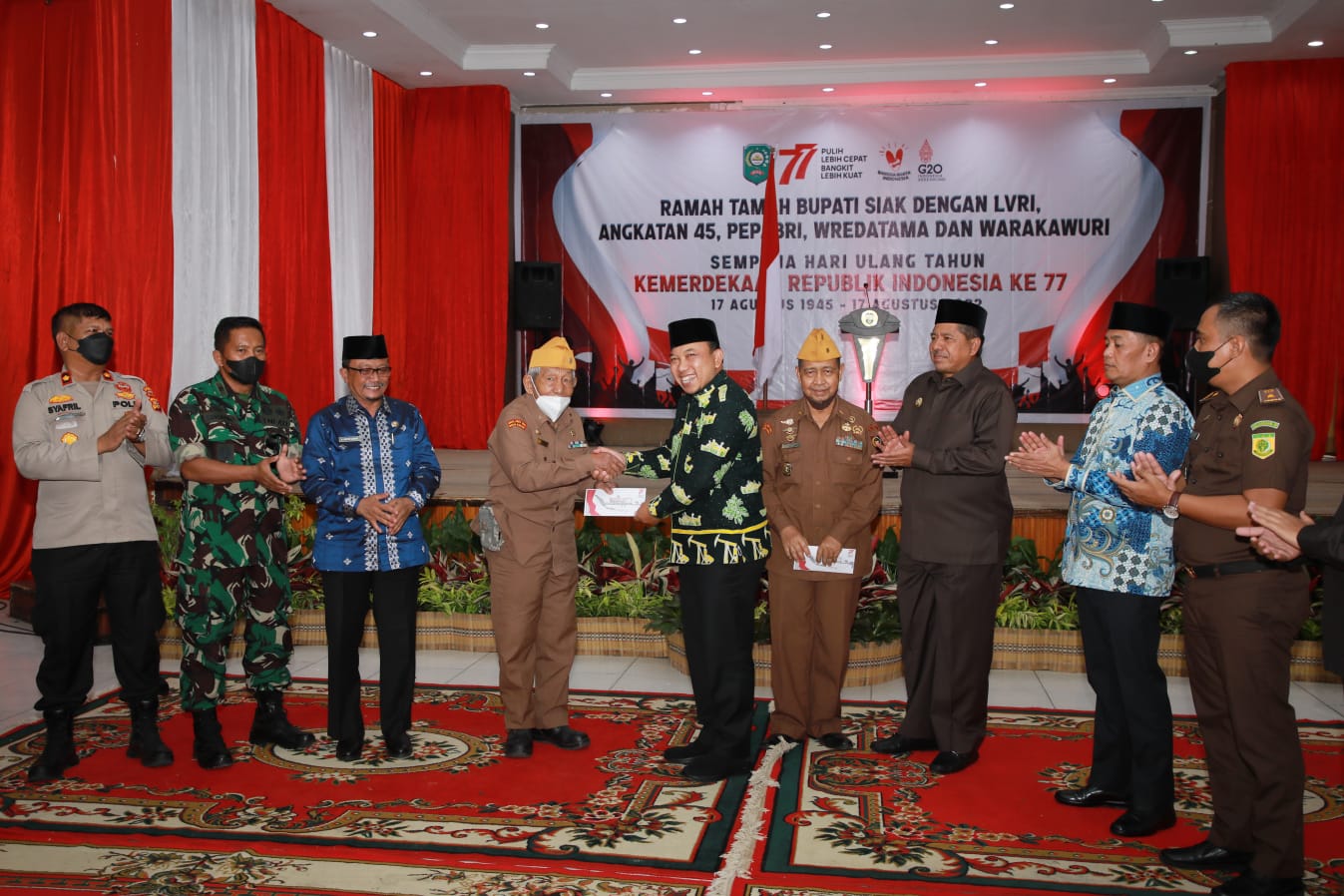 Hal tersebut disampaikan oleh Bupati Siak Alfedri melalui sambutannya pada saat Temu Ramah Tamah Pemerintah Kabupaten Siak bersama Legiun Veteran Republik Indonesia (LVRI), Angkatan 45, Persatuan Purnawirawan Warakawuri TNI dan Polri (Pepabri) Sempena Hari Ulang Tahun Kemerdekaan Republik Indonesia ke 77 tahun 2022, bertempat di gedung Tengku Mahratu Siak Sri Indrapura, selasa (16/8/2022).