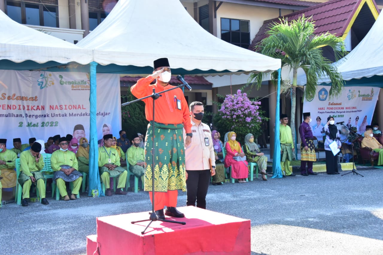 Mandau, Lintaspena.com – Bupati Bengkalis Kasmarni diwakili Staf Ahli Bupati Bidang Kemasyarakatan dan Sumber Daya Manusia H. Alfakhrurrazy memimpin upacara peringatan Hari Pendidikan Nasional, Jum’at, 13 Mei 2022 di Halaman Kantor Camat Mandau.
