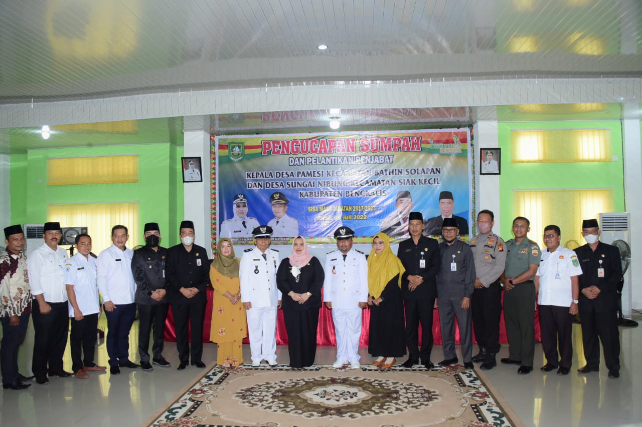BATHIN SOLAPAN, LINTASPENA.COM – Bupati Bengkalis Kasmarni melantik langsung Penjabat (Pj) Kepala Desa Pamesi Ali Ridwan Kecamatan Bathin Solapan dan Penjabat Kepala Desa Sungai Nibung Dadang Saputra Kecamatan Siak Kecil, Rabu 6 Juli 2022, di aula Kantor Camat Bathin Solapan.