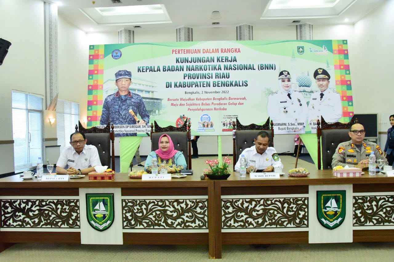 Dalam pertemuan yang bertemakan “Mari kita bersinergi melawan narkoba, mudah mudahan negeri junjungan ini bebas dari narkoba” tersebut, Bupati Kasmarni menyampaikan ucapan selamat datang dan terima kasih kepada Kepala BNNP Riau, atas sinergitasnya selama ini dalam membantu Kabupaten Bengkalis dalam melakukan penaganan serta pencegahan peredaran narkoba yang semakin marak saat ini.