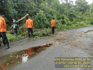 Menerima laporan tersebut, personil Badan Penanggulangan Bencana Daerah (BPBD) Kabupaten Muba langsung mengerahkan personil untuk mengevakuasi pohon tumbang tersebut.