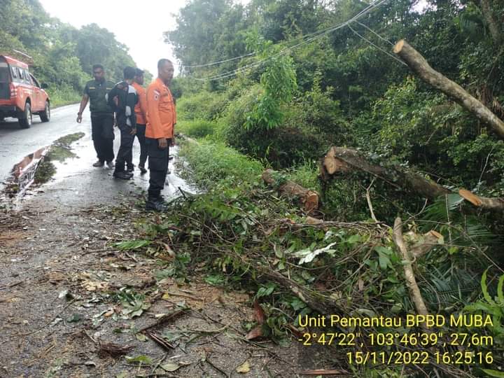 “Hujan lebat yang disertai angin kencang yang melanda, menyebabkan satu pohon tumbang menghambat jalan, Alhamdulillah tidak ada korban jiwa, baik dari pengguna jalan maupun masyarakat sekitar,” kata Kepala BPBD Muba Pathi Riduan SE ATD MM.