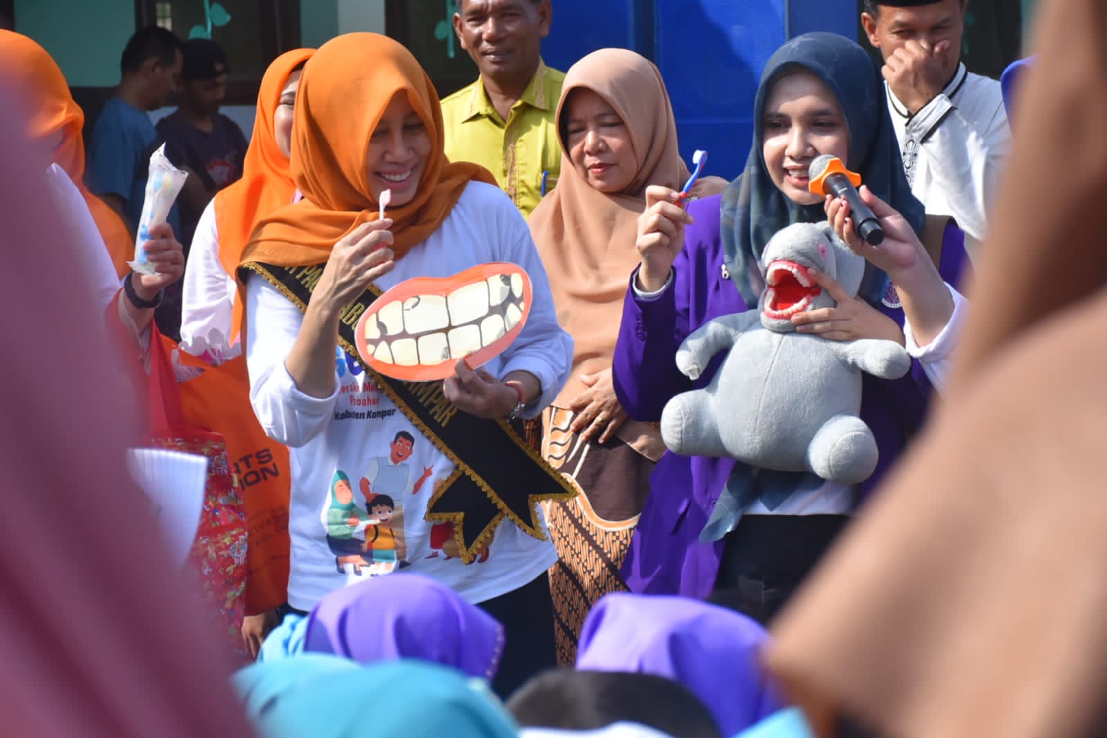 Sembari bercengkerama dengan anak-anak Paud dan SD, Bunda Paud Kabupaten Kampar sempatkan berikan pengetahuan tentang cara menggosok gigi yang baik dan benar bersama PDGI Kabupaten Kampar seraya bagi-bagi sikat gigi kepada murid-murid Paud dan SD. Yang kemudian dilanjutkan penyerahan Alat Peraga Edukatif (APE) sebagai penunjang kegiatan belajar kepada TK/Paud di Desa Gobah Kecamatan Tambang.