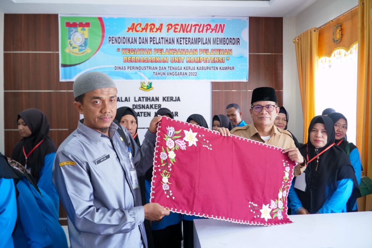 Sementara itu Kepala Dinas Tenaga Kerja dan Perindustrian Kabupaten Kampar Drs. Ali Sabri menyampaikan terimakasih kepada Ketua Dekranasda Kampar Deswita Kamsol atas kesempatan menghadiri dan menutup kegiatan pelatihan membordir ini. Yang mana pelatihan ini diikuti oleh 16 orang. Dan di harapkan agar dapat mengajak dan membagikan ilmu yang di dapat dari pelatihan yang telah diikuti tersebut.