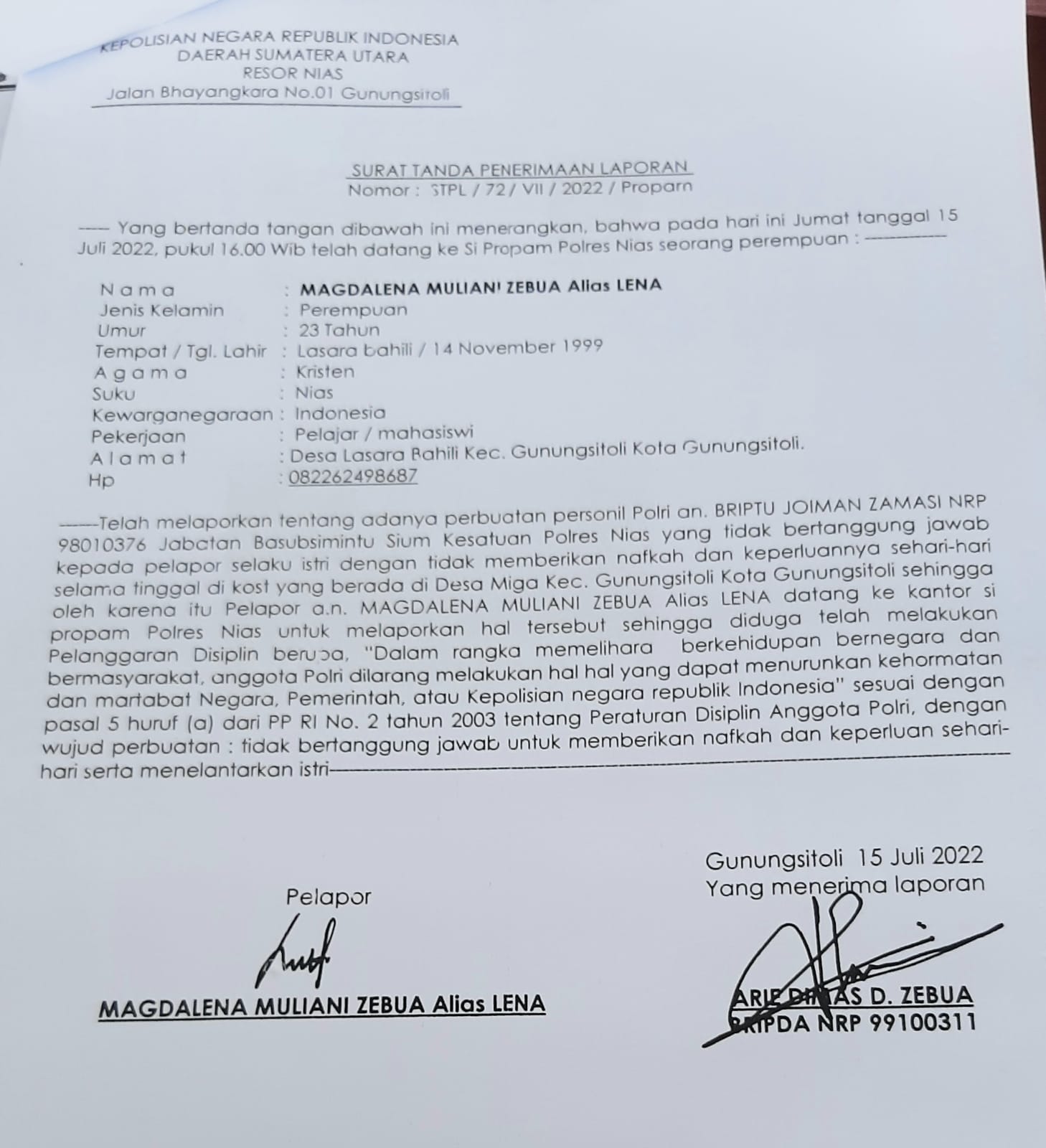 Gunungsitoli, Lintaspena.com – Diduga melanggar kode etik dengan menelantarkan istri, Oknum Anggota Polri yang bertugas di Kepolisian Resort Nias, berinisial (Briptu J) dilaporkan ke Propam Polres Nias, Sumatera Utara, dengan Nomor : STPL/72/VII/2022/Propam.