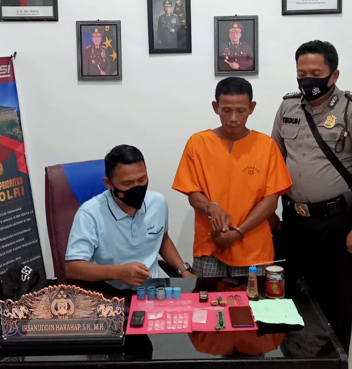 Petani ini berinisial S.S alias Ucok (47 tahun) di ringkus petugas setelah ditemukan barang bukti sabu seberat total 8,82 gram dan alat alat pemakai dengan rincian yakni 18 paket kecil diduga Narkotika jenis sabu, 3 paket sedang diduga Narkotika jenis Sabu, 3 buah botol lem warna biru, 2 buah botol salep warna biru, 1 buah gunting.