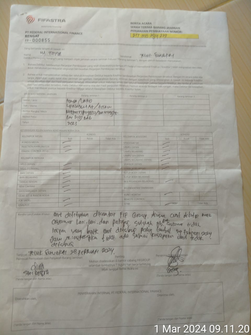 “Tapi sayang saat itu pada Rabu (28/02/2024) malam pemilih motor Saripendra menelpon lewat wa kepada pamannya sebagai wartawan Inhu, mintak bantuan agar motornya jangan di bahwa ke kantor FIF Rengat, saya masih sanggup membayarnya tapi untuk saat ini uang belum ada,” katanya Sarifendra.