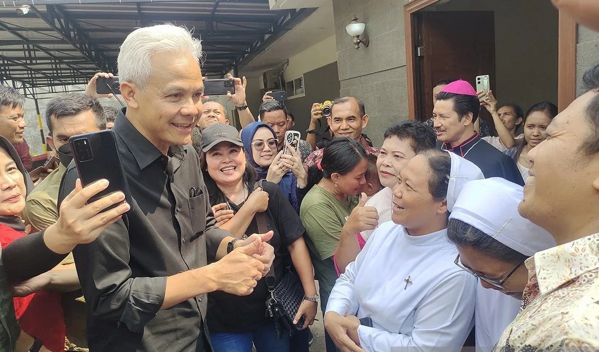 Bakal capres Ganjar Pranowo saat berkunjung ke Keuskupan Tanjungkarang di Kota Bandarlampung, Lampung, Kamis (26/10/2023). ANTARA/Dian Hadiyatna/aa.