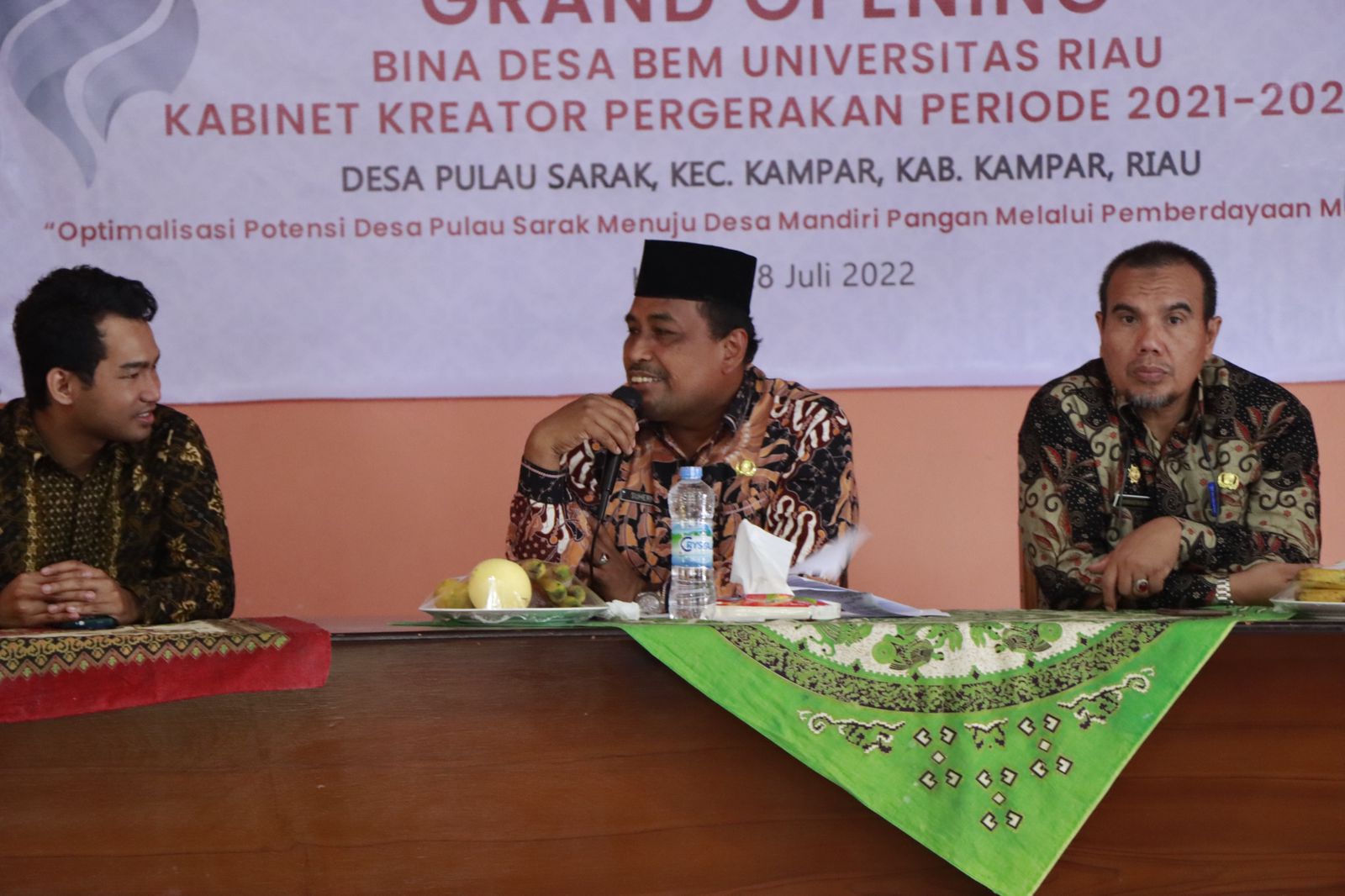 Kepala Desa Pulau Sarak Erwin Syaputra, menyampaikan ucapan terima kasih kepada Pemerintah Daerah Kabuapten Kampar atas support yang diberikan atas kegiatan ini, selanjutnya kami berharap melalui kegitan Bina Desa BEM UR mampu kita kembangkan atas potensi yang ada di Desa ini, seperti potensi di BIdang Pertanian, Hortikultura dan yang paling terkenal saat ini potensi Air Sikumbang Desa Pulau Sarak.