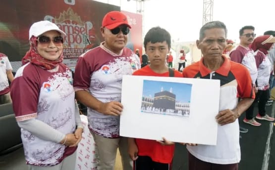 Warga Perumahan Kalianda Residence, Blok B9 Nomor 5, Kelurahan Way Urang, Kecamatan Kalianda ini berhasil memenangi hadiah utama jalan sehat Lampung Selatan Expo 2024, yakni umrah gratis.