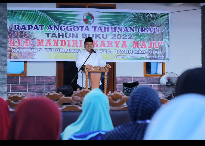 Hal tersebut disampaikan oleh Bupati Siak Alfedri saat menghadiri Rapat Anggota Tahunan Koperasi Unit Desa (RAT KUD) Mandiri “Karya Maju” tahun buku 2022, yang dilaksanakan di Halaman KUD Karya Maju, Kampung Berumbung Baru, Kecamatan Dayun, Rabu (15/2/2023).