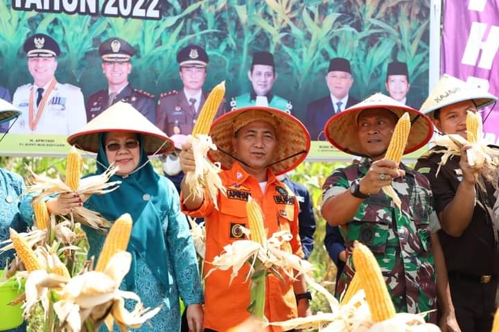 Menjalankan Program Ketahanan pangan sesuai instruksi Presiden Jokowi Pemkab Musi Banyuasin Berkolaborasi dengan Kodim 0401 Menjalankan program penanaman jagung di Kabupaten Musi Banyuasin, Usai dilakukan penanaman sejak Juli lalu, akhirnya Tanaman Jagung hasil kolaborasi Kodim 0401 Muba bersama Pemkab Muba dilakukan panen perdana di Pendopo Pal 11 Kecamatan Sekayu yang dilaksanakan langsung oleh Pj Bupati H Apriyadi bersama Ketua TP PKK Muba Hj Asna Aini Apriyadi dan Kodim 0401 Muba, Kamis (20/10/2022).