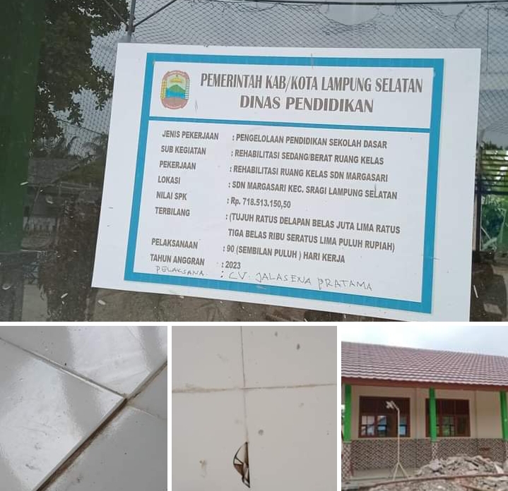 Lintaspena.com, Lamsel – Proyek Rehabilitasi ruang kelas SDN 1 Margasari Kecamatan Sragi menjadi sorotan masyarakat. Bagaimana tidak, proyek yang bernilai Rp.718.513.150, 50,- (Tujuh Ratus Delapan Belas Juta Lima Ratus Tiga Belas Ribu Seratus Lina puluh Ribu) dari Dinas Pendidikan Kabupaten Lampung Selatan Tahun Anggaran 2023 dikerjakan oleh pelaksana amatiran dan diduga diperjualbelikan.