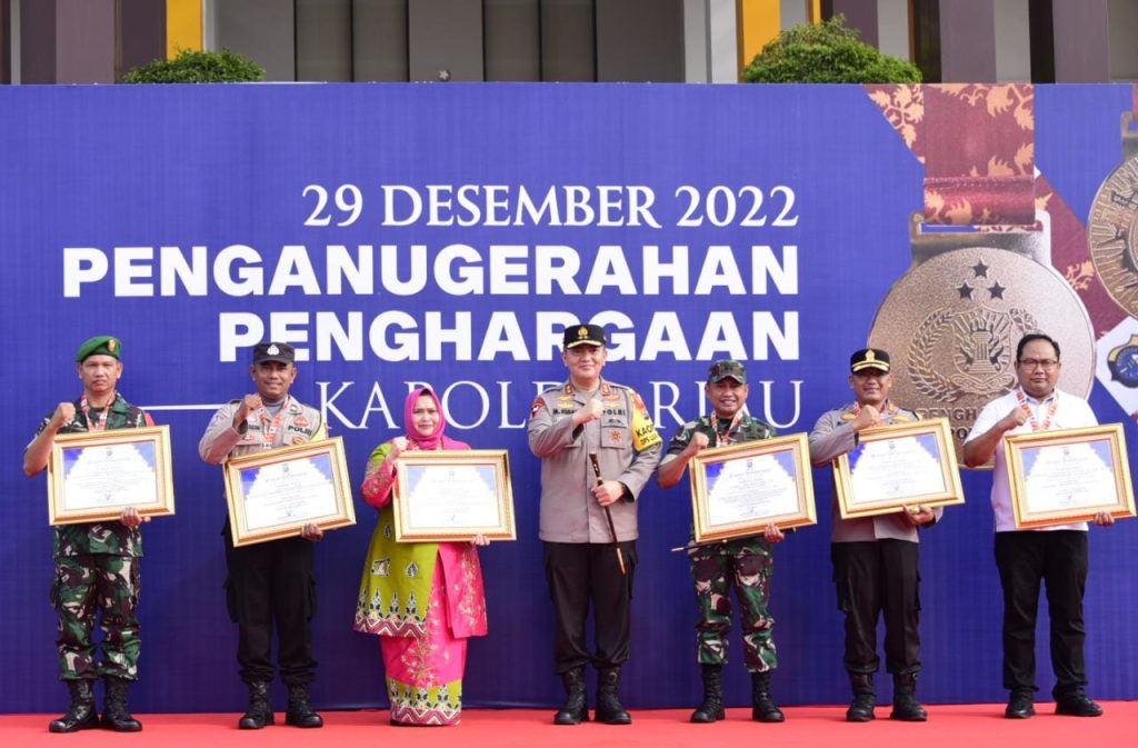 Pekanbaru, Lintaspena.com – Kepala Kepolisian Daerah (Kapolda) Riau Irjen. Pol. Muhammad Iqbal memberikan penghargaan kepada Bupati Bengkalis Kasmarni sebagai Kepala Daerah kabupaten/kota terbaik dalam memajukan organisasi Polri dan mendukung keberhasilan tugas kepolisian diwilayah hukum Polda Riau, Kamis pagi, 28 Desember 2022.