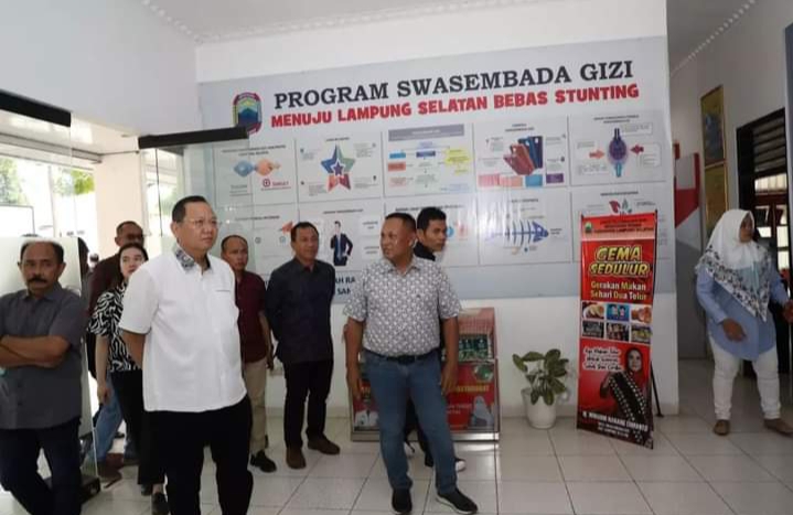 Didampingi oleh Bupati Lampung Selatan H. Nanang Ermanto, Sudin nampak berkeliling masuk kedalam Sekretariat Swasembada Gizi tersebut sambil melihat data-data penurunan stunting dan pencapaian serta penghargaan yang berhasil di raih oleh Kabupaten Lampung Selatan yang terpajang didinding sekretariat tersebut.