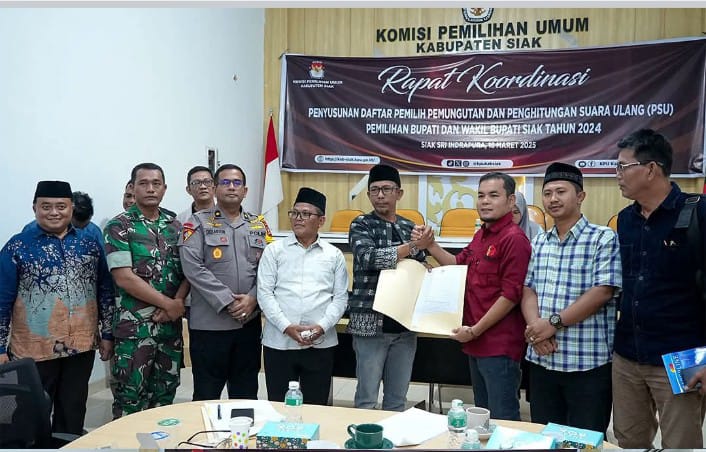 Siak, Lintaspena.com – Komisi Pemilihan Umum (KPU) Kabupaten Siak, menggelar Rapat Koordinasi penyusunan Daftar Pemilih Pemungutan dan Penghitungan Suara Ulang (PSU) pemilihan Bupati dan Wakil Bupati Kabupaten Siak Tahun 2024 berlangsung di Ruang Rapat Kantor KPU Kabupaten Siak, Selasa malam (18/3/2025).