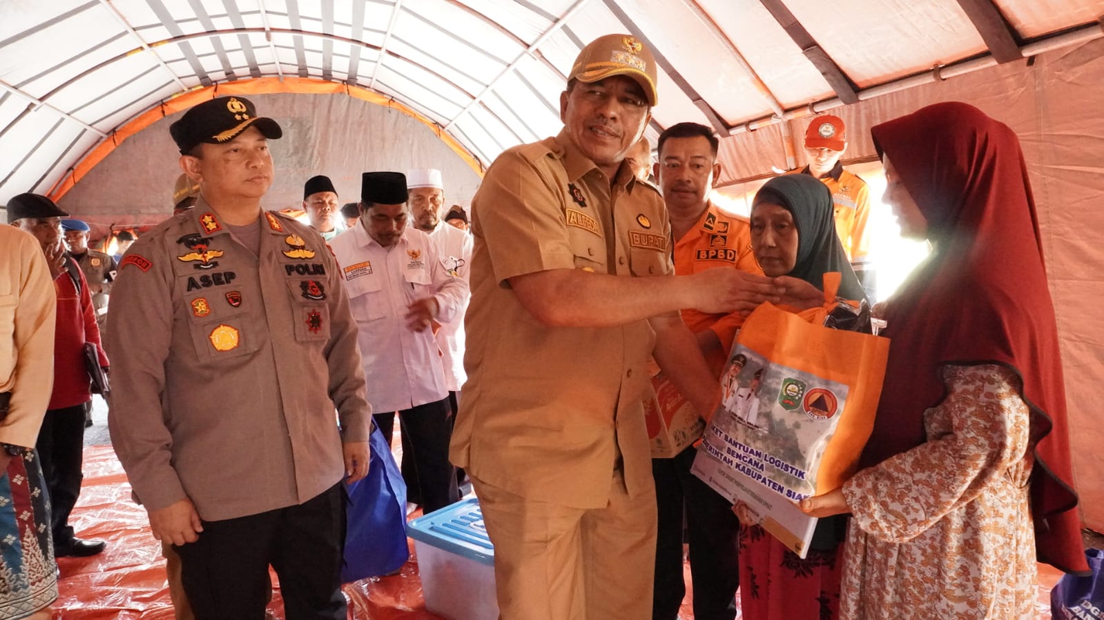 Bupati Alfedri hadir di damping Kapolres Siak AKBP Asep Sujarwadi usai melakukan peninjauan di lokasi kebakaran, dan menemui para korban di tenda darurat menyampaikan turut prihatin atas musibah yang di alami warga Sungai Apit. Tetap bersabar dalam menghadapi ujian ini.