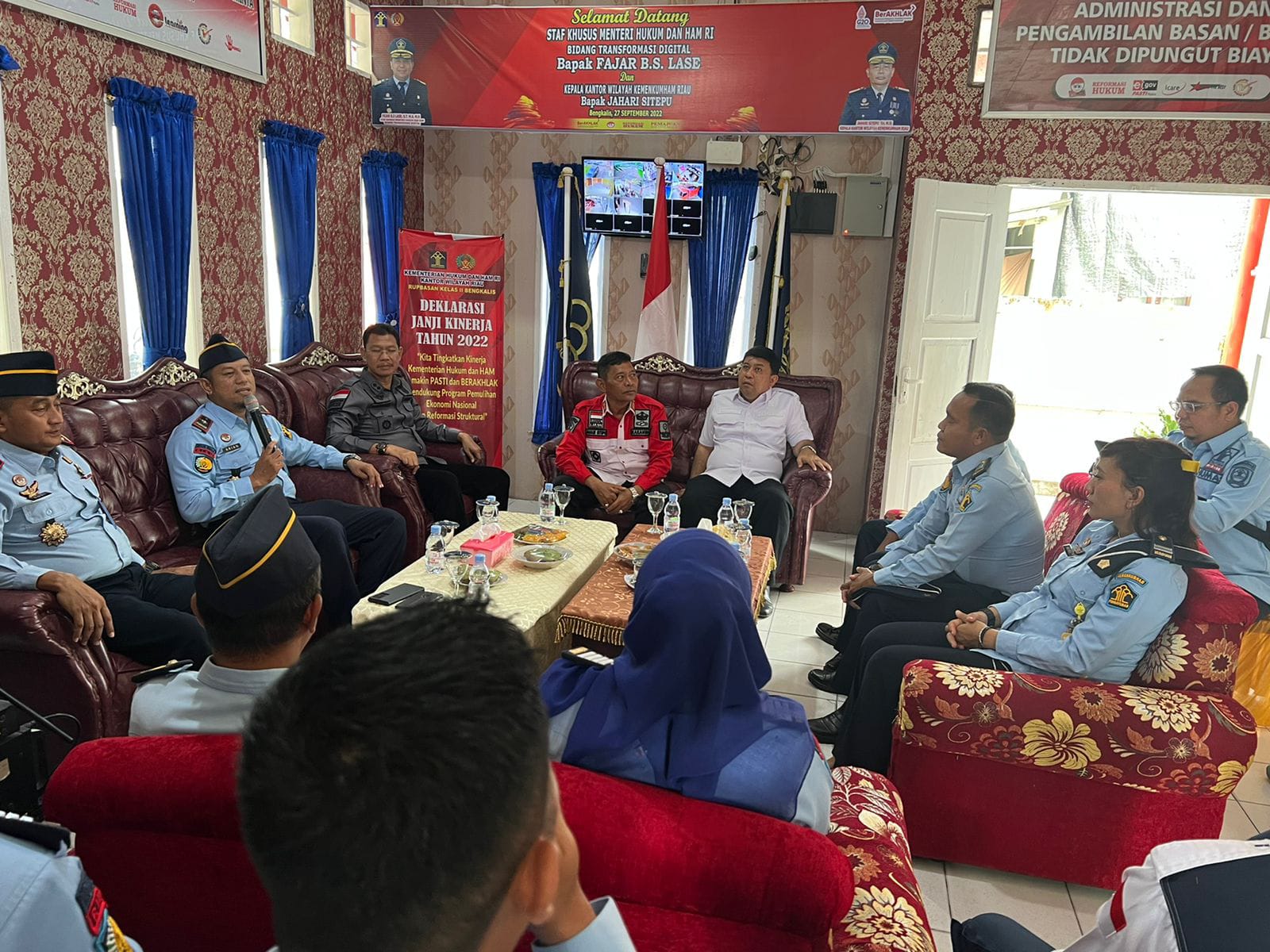 BENGKALIS, LINTASPENA.COM – Staf Khusus Kementerian Hukum dan Hak Asasi Manusia (Kemenkumham) Bidang Transformasi Digital Fajar B.S Lase melakukan kunjungan kerja ke Kantor Rumah Penyimpanan Barang Sitaan Negara (Rupbasan) Kelas II A Bengkalis, Selasa, 27 September 2022.