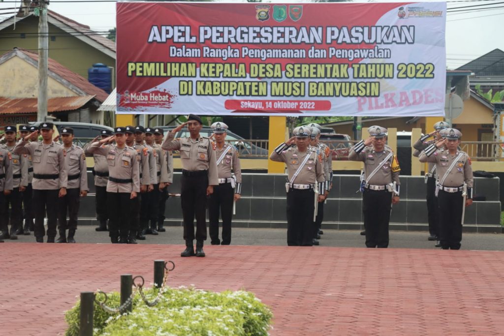 Sekayu Muba, Lintaspena.com – Dalam rangka Pengamanan Pemilihan Kepala Desa Serentak Tahun 2022 di kabupaten Musi banyuasin. Polres Musi Banyuasin menggelar apel pergeseran pasukan di lapangan Mapolres Muba, Jumat (14/10/22).