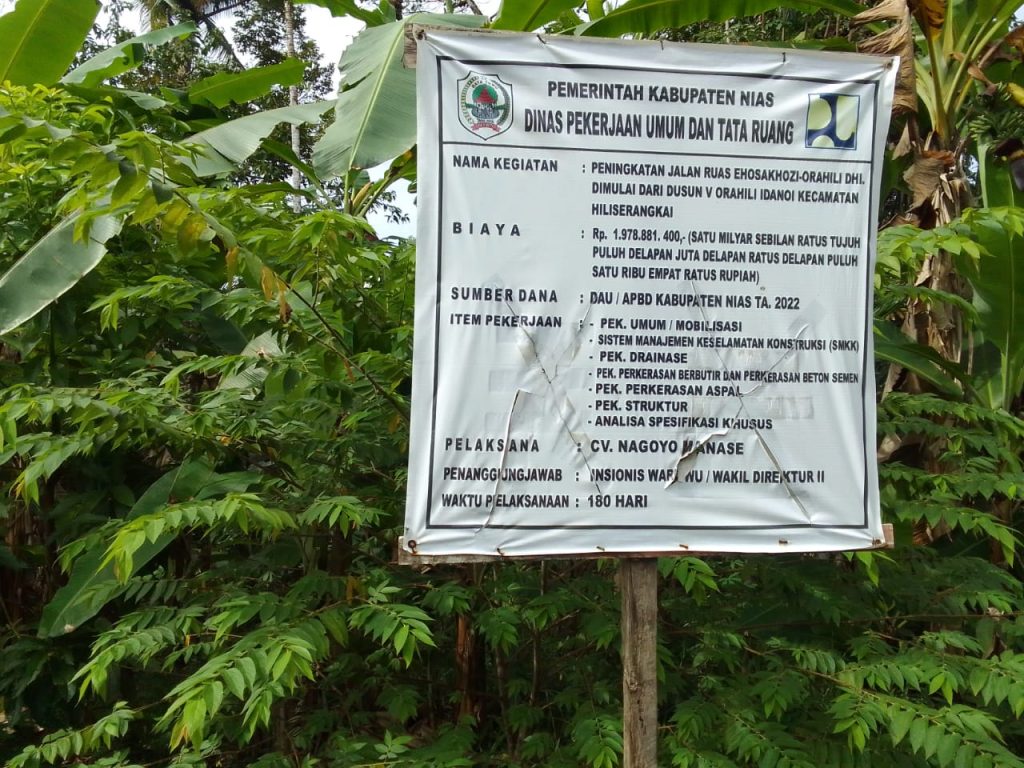 Pekerjaan tersebut tampak terlihat dari hasil pengaspalan yang sudah dilakukan dan sudah mengalami rusak parah. Anggaran pembangunan jalan tersebut sebesar Rp.1.978.881.400 (satu milyar sembilan ratus tujuh puluh delapan juta delapan ratus delapan puluh satu ribu empat ratus rupiah) yang bersumber dari DAU/APBD Kabupaten Nias TA 2022 yang dikerjakan oleh CV. Nagoyo Manase. Rabu (25/01/2023).