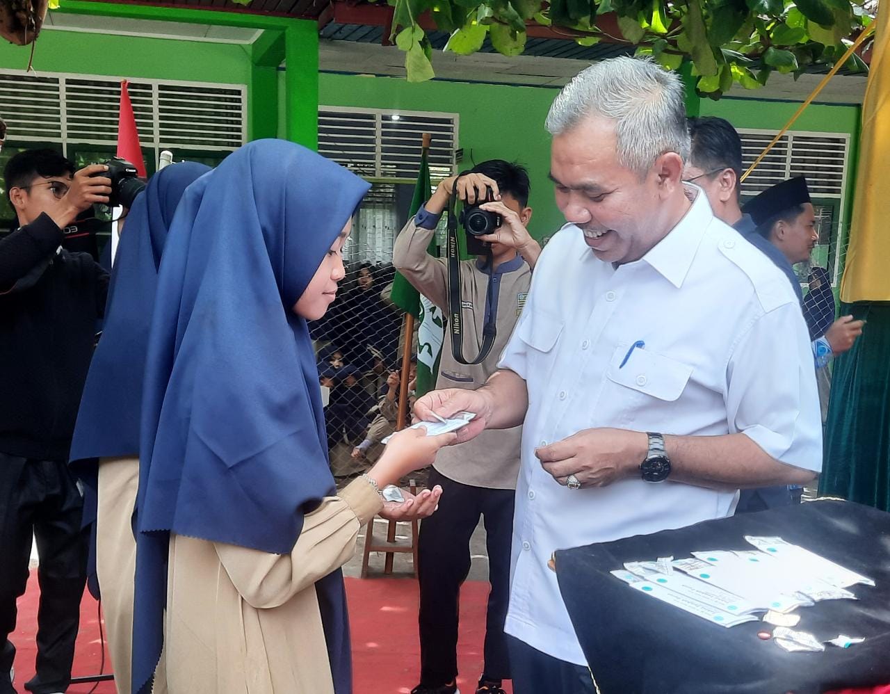 Dihadiri Kepala Sekolah MTs Mualimin Muhammadya Muhammad Tibri, para guru dan seluruh siswa. Dr Kamsol sebelum memberikan arahan terlebih dahulu menyerahkan secara simbolis Tablet Tambah Darah ( TTD ) kepada para siswi.