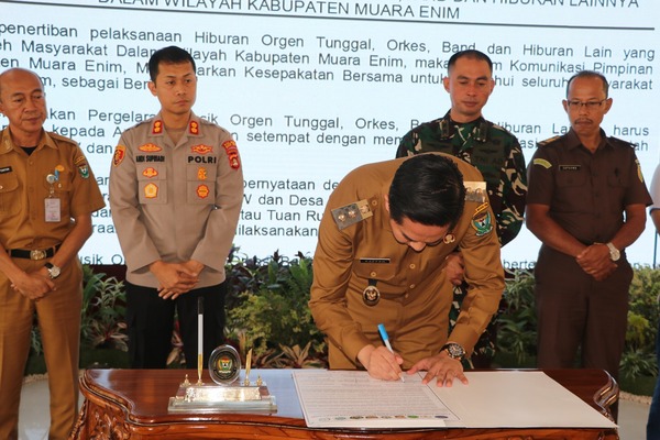 Lintaspena.com, Muara Enim – Sebagai wujud komitmen bersama dalam menjaga keamananan, kenyamanan dan ketertiban masyarakat (Kamtibmas) serta mencegah tindak pidana kejahatan dan penyakit masyarakat seusai Perda Kabupaten Muara Enim Nomor 06 Tahun 2019 tentang Penyelenggaraan Ketertiban Umum dan Ketentraman Masyarakat, sebanyak 246 Kepala Desa se-Kabupaten Muara Enim menandatangani kesepakatan bersama dengan Forkopimda mengenai Penertiban Pelaksanaan Hiburan Orgen Tunggal, Orkes, Band dan Hiburan lainnya di Kabupaten Muara Enim.