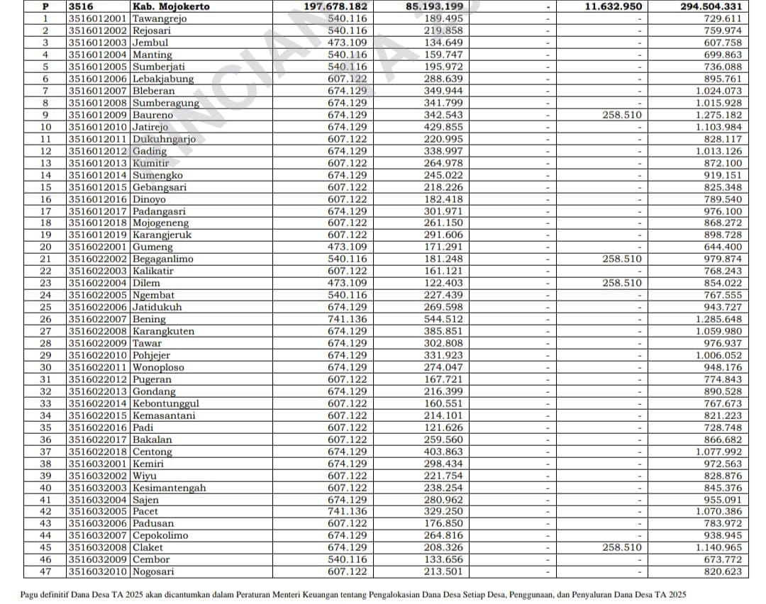 Berikut daftar rincian lengkap transfer pembagian DD per desa TA 2025 di Kabupaten Mojokerto :