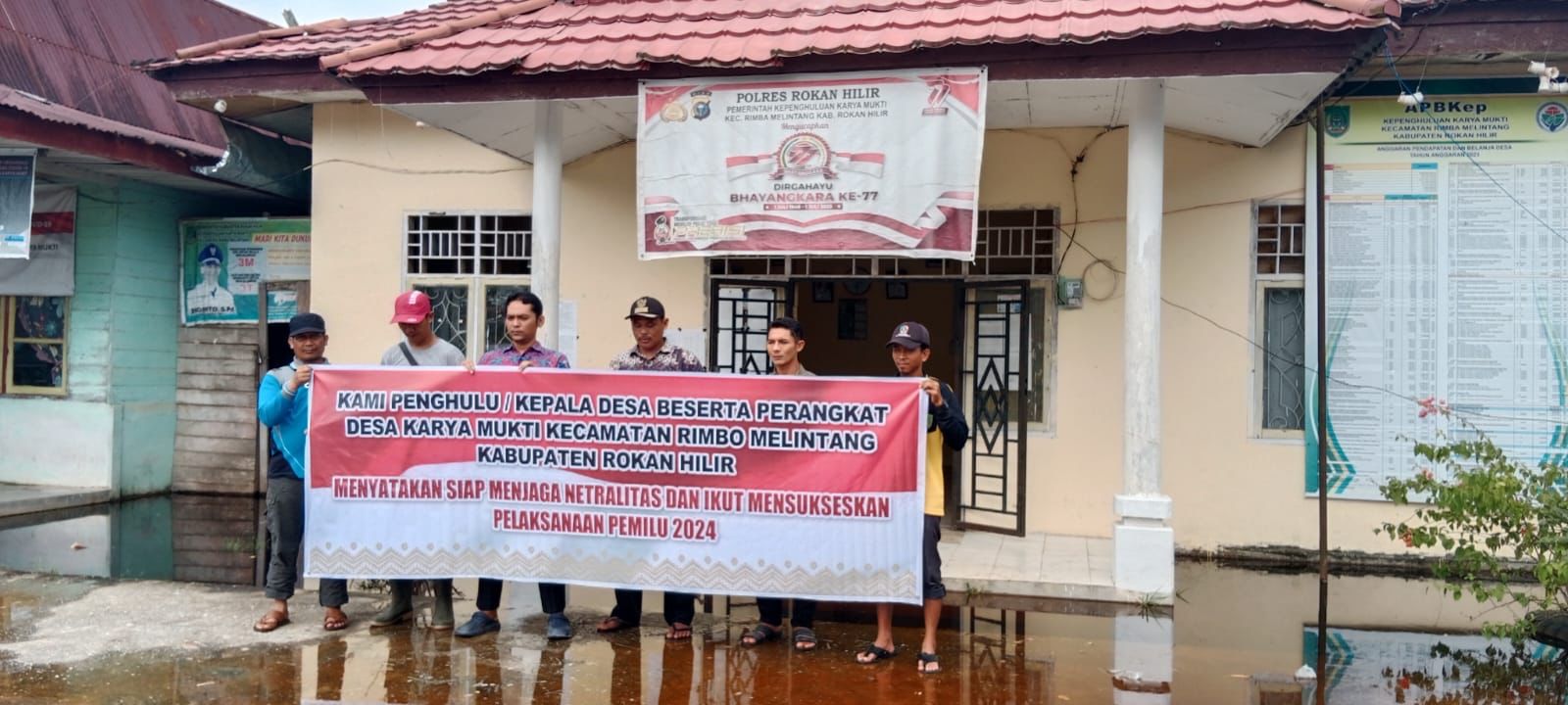 Maka disela banjir yang melanda Kepenghuluan Karya Mukti Kec. Rimbo Melintang Kabupaten Rokan Hilir An. Sugianto selaku Penghulu beserta perangkat melakukan deklarasi pernyataan sikap dalam menjaga Netralitas dan mensukseskan pelaksanaan Pemilu.