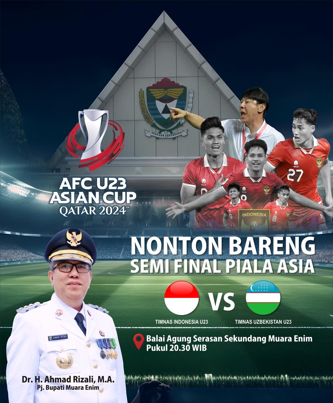 Lintaspena.com, Muara Enim – Semi Final Piala AFC Asian Cup U23 Indonesia VS Uzbekistan Senin (29/4/2024) Bupati Muara Enim akan menggelar Acara Nonton Bareng (Nobar) di Balai Agung Serasan Sekundang (BASS) Muara Enim.