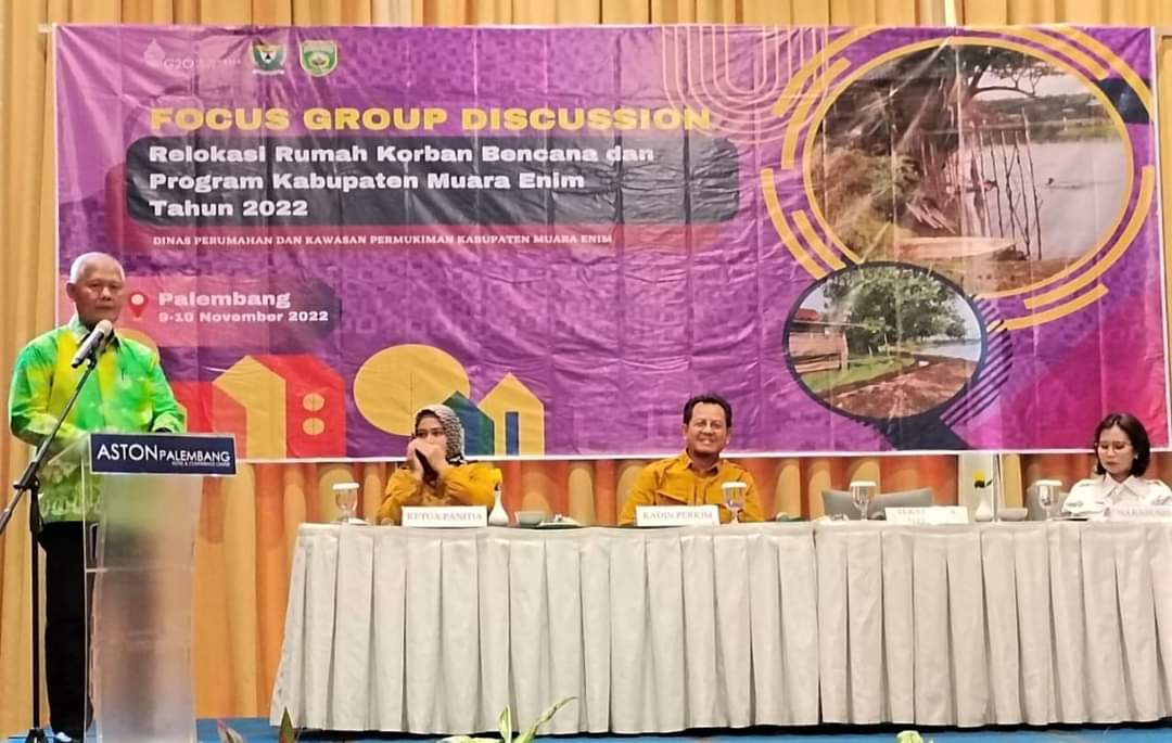 Pemerintah Kabupaten Muara Enim melalui Dinas Perumahan dan Kawasan Pemukiman menggelar Kegiatan FGD (Focus Group Discussion) Relokasi Rumah Korban Bencana dan Program Pemerintah Kabupaten Muara Enim Tahun 2022 di Hotel Aston Palembang, Rabu (09/11/2022).