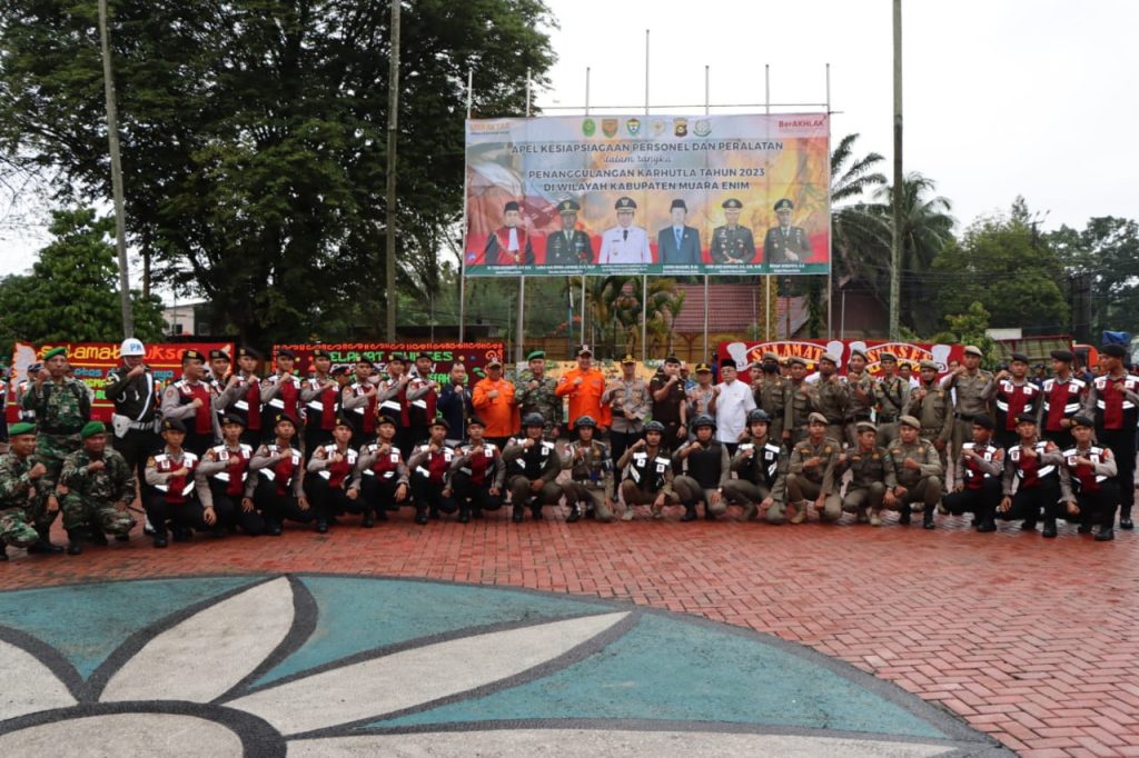 Kegiatan apel gabungan dalam rangka kesiapsiagaan dan penanggulangan Karhutla dihadiri Kapolres Muara Enim AKBP Andi Supriadi, SH, SIK, MH, Plt Bupati Muara Enim Ahmad Usmarwi Kaffah, SH. LL.M, Ph.D, Kasdim 0404 Muara Enim, Anggota DPRD Muara Enim, PN. Muara Enim, Kajari Muara Enim, Para PJU Polres Muara Enim, Para OPD Kab. Muara Enim dan Para Kapolsek jajaran Polres Muara Enim.