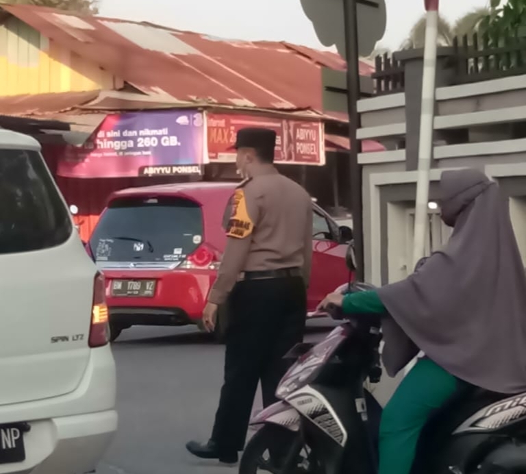Seperti terlihat Bhabinkamtibmas Kelurahan Tangkerang Labuai Polsek Bukit Raya Polresta Pekanbaru Bripka Bambang Cahyadi melaksanakan pengaturan lalu lintas di Simpang Jl. Kelapa Sawit Ujung Kelurahan Tangkerang Labuai Kecamatan Bukit Raya Kota Pekanbaru, Rabu (31/08/2022) pagi.