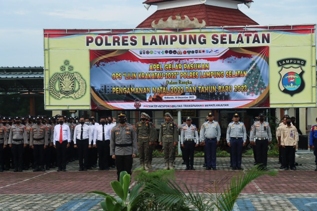 Pengamanan Natal dan Tahun Baru 2023 di Wilayah Kabupaten Lampung Selatan, Polres Lampung Selatan menggelar 12 pos pengamanan dan melibatkan 586 personil gabungan yang terdiri dari Polri 295, TNI 70, Dishub 54, Pol PP 82, Dinkes 80, Damkar 12, Basarnas 18, Senkom 24 dan instansi pendukung lainnya.