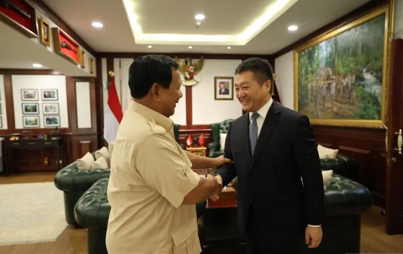 Keterangan foto: Menteri Pertahanan RI Prabowo Subianto (kiri) di Kantor Kementerian Pertahanan RI, Jakarta, 21 Maret 2024, menerima kunjungan dari Duta Besar China untuk Indonesia Lu Kang yang mengantarkan surat ucapan selamat dari Presiden China Xi Jinping untuk Prabowo. ANTARA