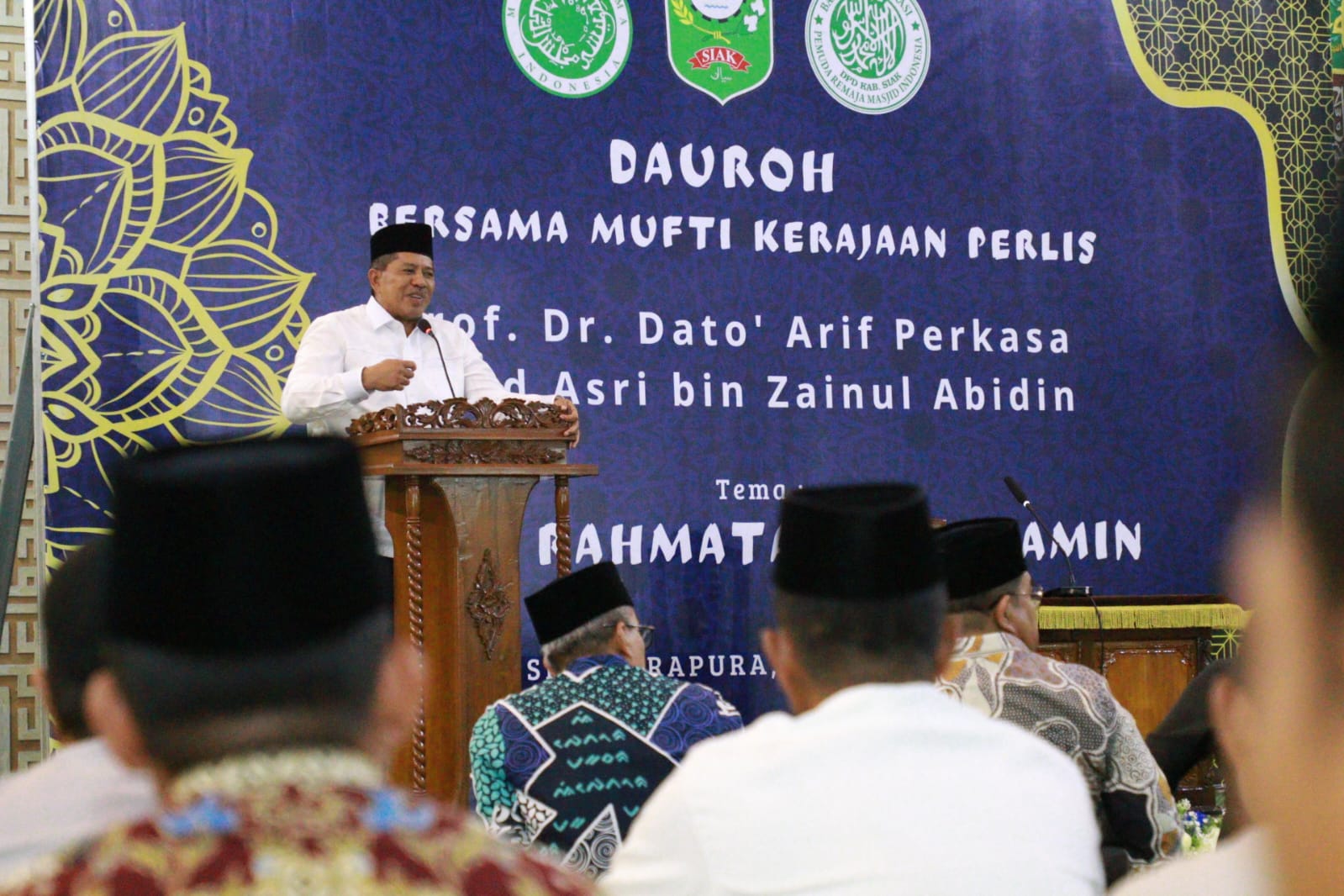 “Atas nama Pemerintah Kabupaten Siak dan masyarakat kami mengucapkan selamat datang kepada Prof. Dr. Dato’ Arif Perkasa Mohd Asri Bin Zainul Abidin dan keluarga di Kabupaten Siak kota istana, dimana dulunya Siak dan johor merupakan serumpun,” ungkap Bupati Alfedri saat menyampaikan sekapur sirih, di hadapan para Jemaah Dauroh.