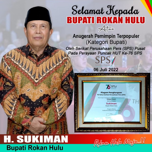 Pekanbaru, Lintaspena.com – Bupati Rokan Hulu H. Sukiman meraih penghargaan Pemimpin Terpopuler di Media Arus Utama Kategori Pemimpin Daerah dari Serikat Perusahaan Pers (SPS) Pusat.