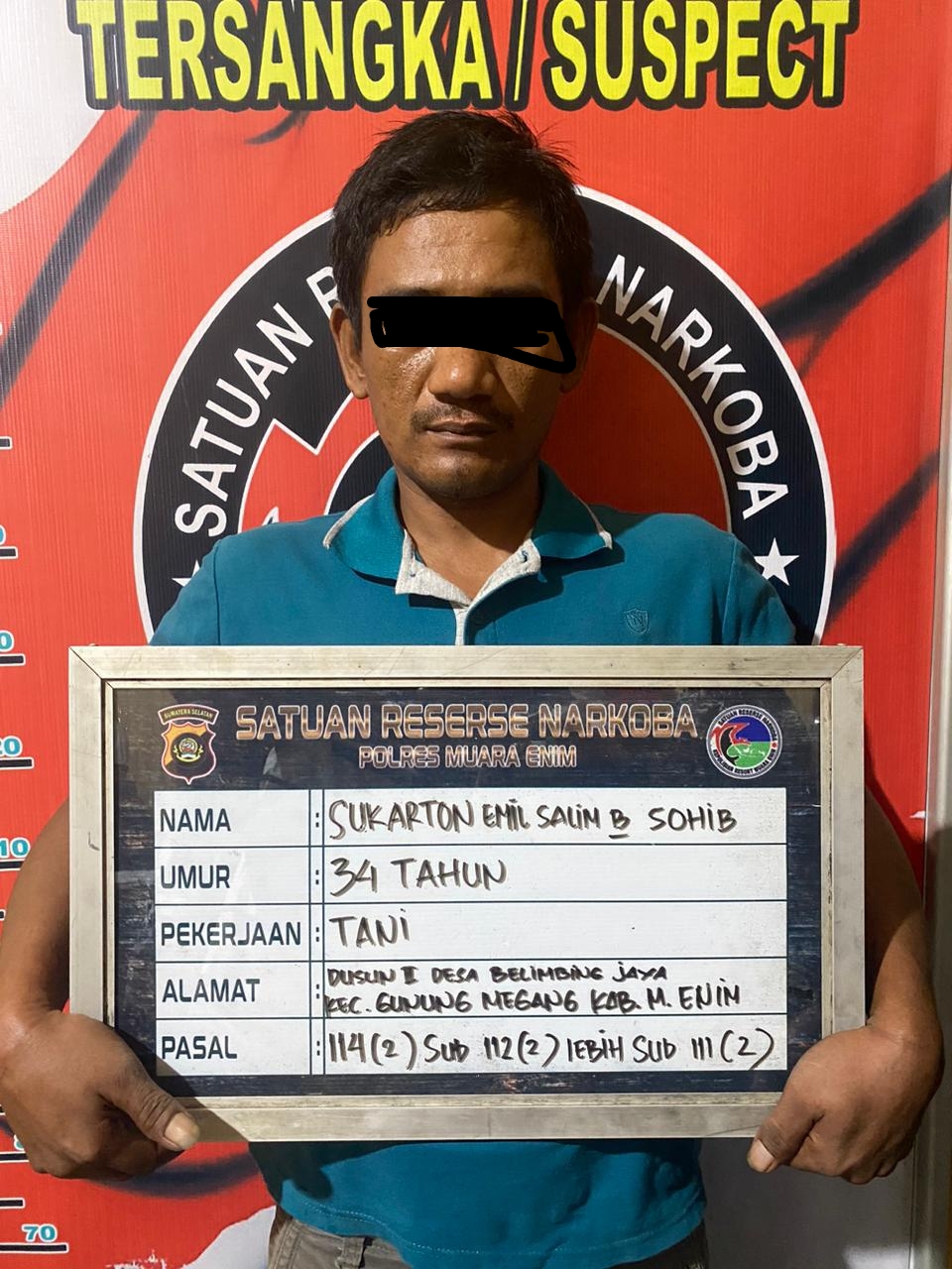 Kapolres Muara Enim AKBP Andi Supriyadi melalui Kasat Resnarkoba AKP Darmanson SH MH mengatakan, ungkap kasus perkara Narkotika Polres Muara Enim melakukan penangkapan pada seorang tersangka bandar Sukarton Emil Salim Bin Sohib (34). Berawal adanya informasi dari masyarakat bahwa di TKP sering dijadikan tempat untuk transaksi narkotika.