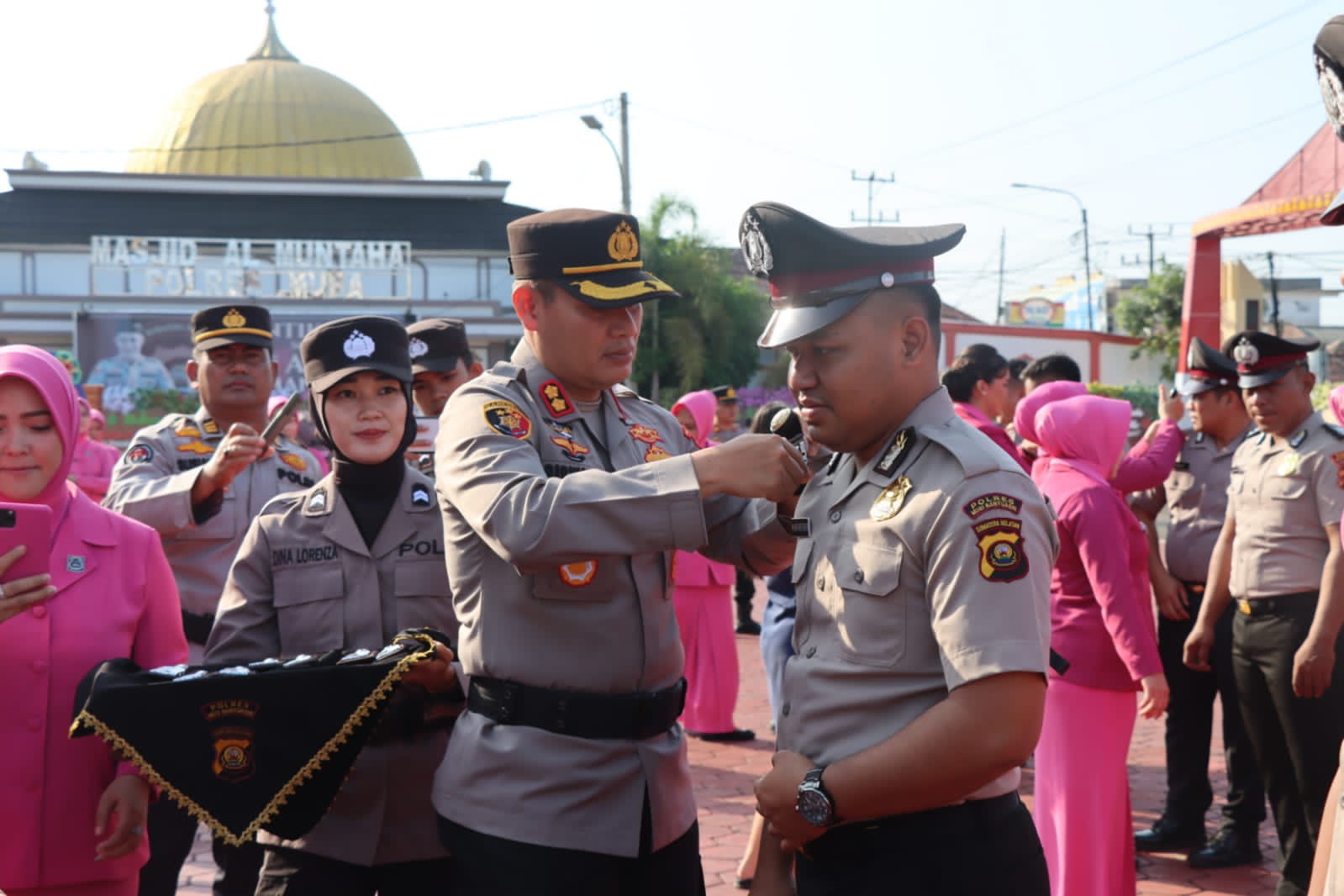 Selesai upacara laporan kenaikan pangkat dilanjutkan dengan ucapan selamat dimulai dari Kapolres Muba dan Ketua Bhayangkari Cabang Polres Muba diikuti oleh Para pejabat utama, para perwira dan seluruh personil Polres Muba.