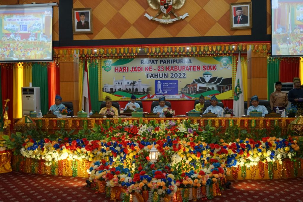 Siak, Lintaspena.com – Memperingati hari jadi ke-23 kabupaten siak tahun 2022, pemerintah kabupaten Siak mengelar Rapat Paripurna istimewa, acara berlangsung di Ruang Rapat Putri Kacamayang DPRD Kabupaten Siak. Bupati Siak Alfedri dalam sambutannya, bersyukur karena tepat hari ini Rabu 12 Oktober 2022, Kabupaten Siak telah berusia 23 tahun.