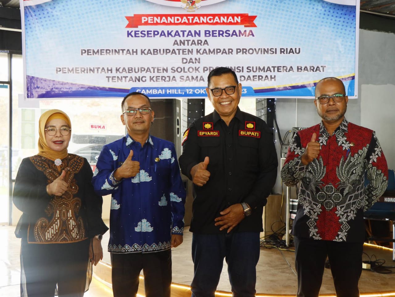 Kerjasama yang langsung di tandatangan oleh Pj Bupati Kampar H Muhammad Firdaus,SE,MM dan Bupati Solok H Epyardi Asda,M Mar, tersebut dilaksakan langsung di kawasan wisata Cambai Hill Kecamatan Danau Kembar Kabupaten Solok Provinsi Sumatera Barat, kamis (12/10/2023).