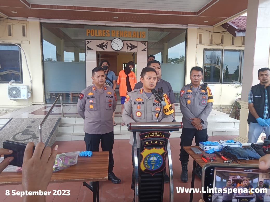 Bengkalis, Lintaspena.com – Polres Bengkalis gelar konferensi pers terkait ungkapan kasus pencurian dengan kekerasan yang mengakibatkan satu orang korban meninggal dunia seorang Asisten Rumah Tangga (ART) di sebuah rumah mewah jalan Rumbia Bengkalis kota, Kecamatan Bengkalis Kabupaten Bengkalis, Jum’at 8 September 2023, Sore. dihalaman Mapolres Bengkalis jalan Pertanian Desa Senggoro.