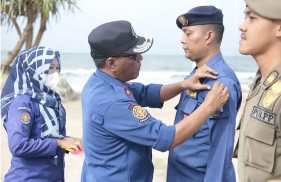 Kepala Dinas Damkar dan Penyelamatan Kabupaten Lampung Selatan M. Sefri Masdian membuka secara resmi kegiatan pelatihan water rescue yang ditandai dengan penyematan tanda pelatihan terhadap tim anggota water rescue di Pantai Beach Kalianda, Rabu (6/3/2024).