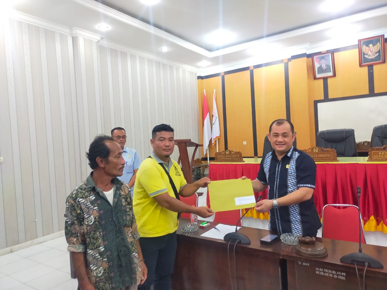 Puluhan warga Desa Miga saat mendatangi gedung DPRD Kota Gunungsitoli untuk menyampaikan laporan pengaduan, diterima oleh wakil ketua DPRD Kota Gunungsitoli Herman Jaya Harefa, didampingi oleh Sekwan DPRD Kota Gunungsitoli pada Jumat (16/06/2023).